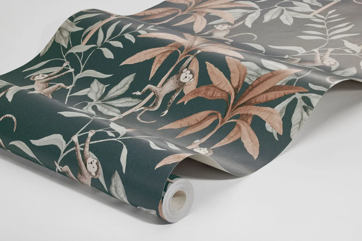 Coloured in a warm and inviting palette of teals and rusty reds on a muted dark blue background , our Jungle Friends children’s wallpaper creates a unique and adventurous expression. Monkeys swing and palm trees grow up the walls in this playful and lovely design.