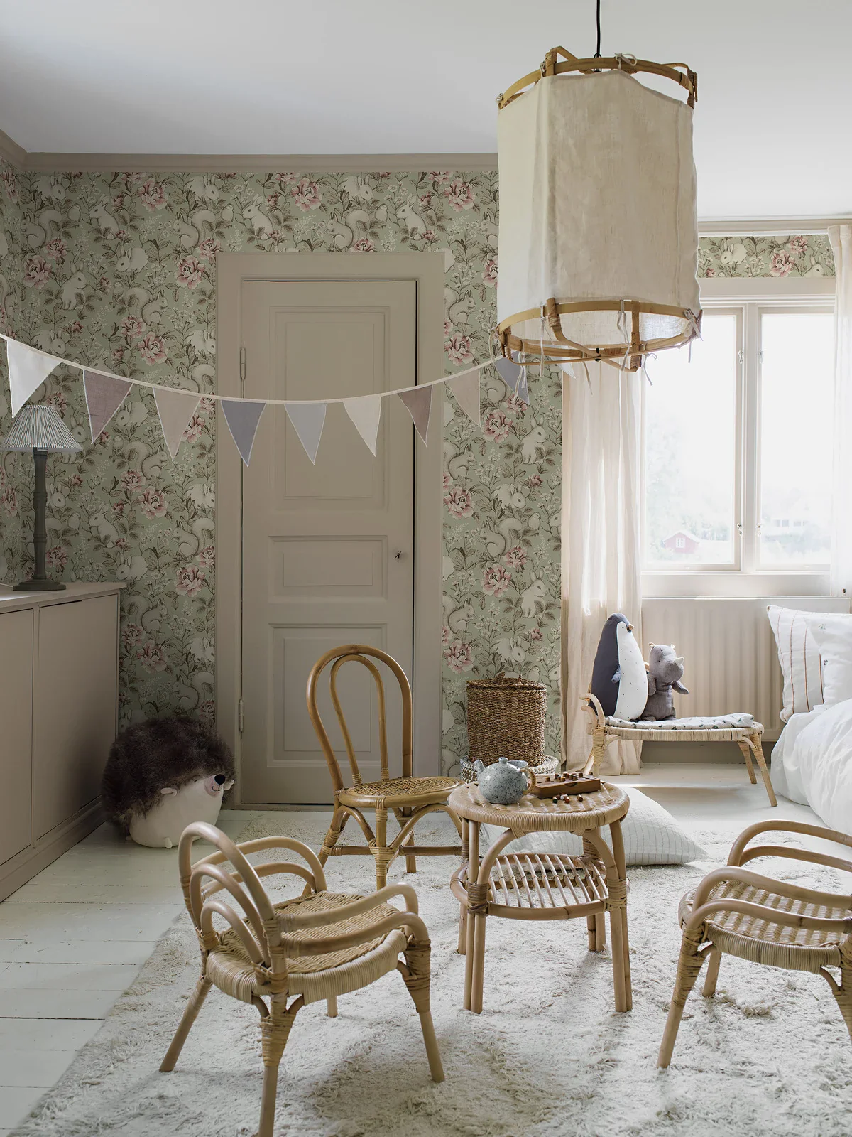 Borastapeter's Magic Forest wallpaper invites your child to embark on an enchanting journey with its beautifully shaded green background, adorned with pale pink flowers and linen beige-toned foliage. Featuring an adorable pattern of playful rabbits, curious squirrels and flamboyant flowers, it sets the stage for enduring adventures. It has been created in collaboration with Swedish lifestyle brand Newbie. Hang it in bedrooms, nurseries and play areas to nurture a lifelong love of the natural world and its many marvels.