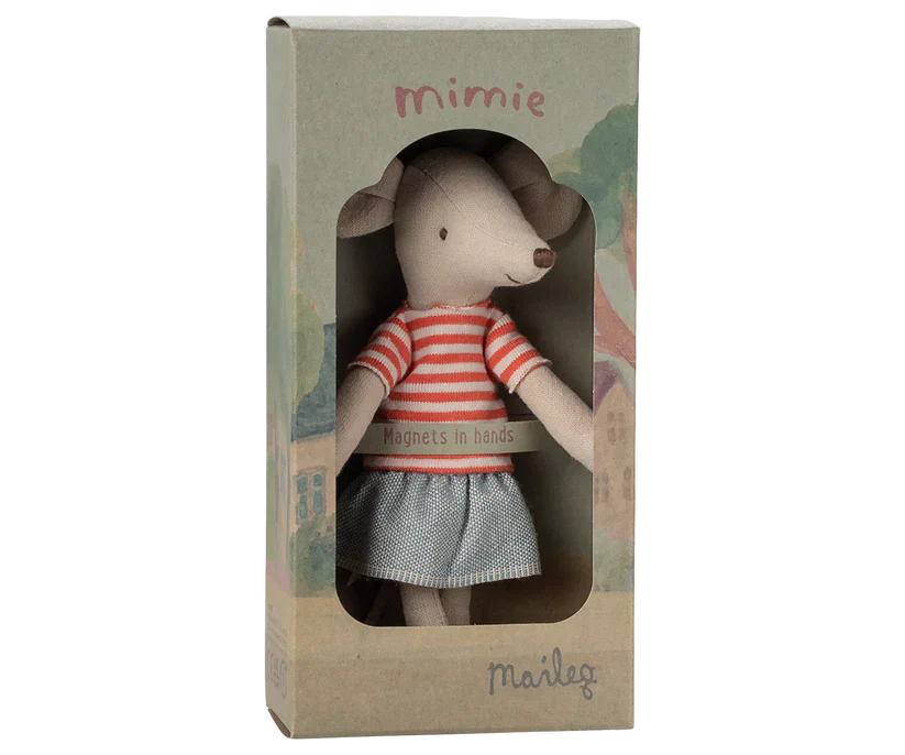 This mouse is the sister of LouiMax and she wears a red striped t-shirt and a denim skirt. She has magnets in her hands and is sold in a very nice decoration box.